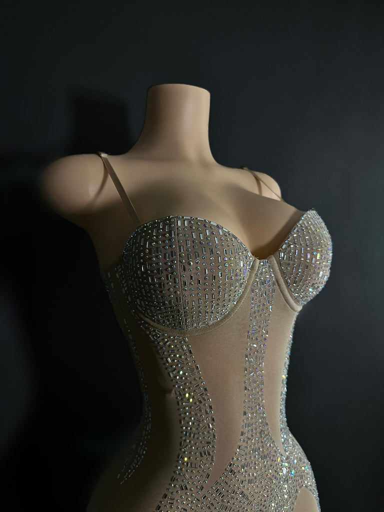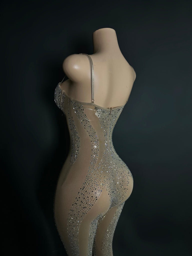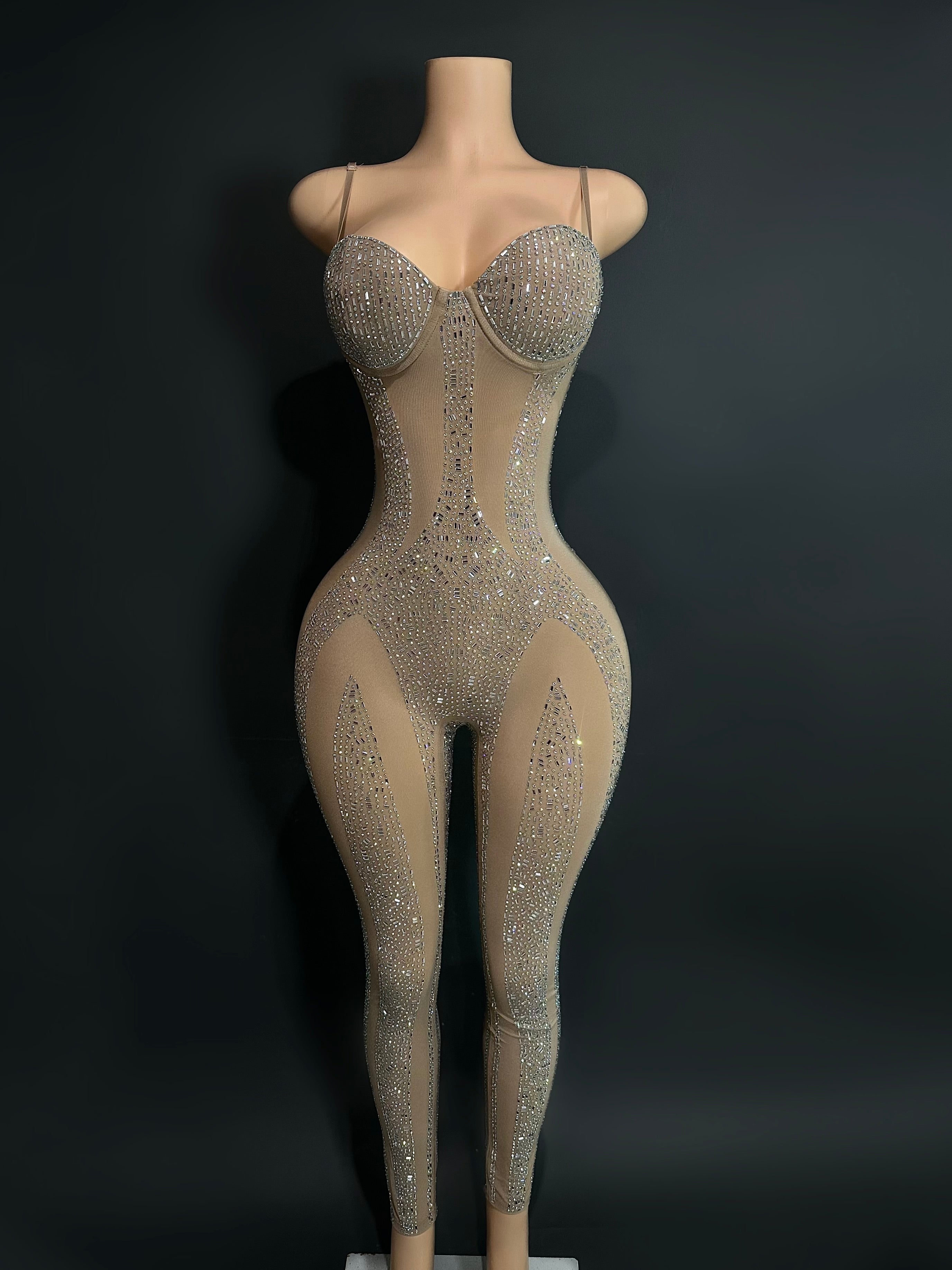 The sexiest jumpsuit, comes with a lot of stretch, very high quality rhinestones with adjustable straps, and side zipper to zip up. You NEED this to stand out!