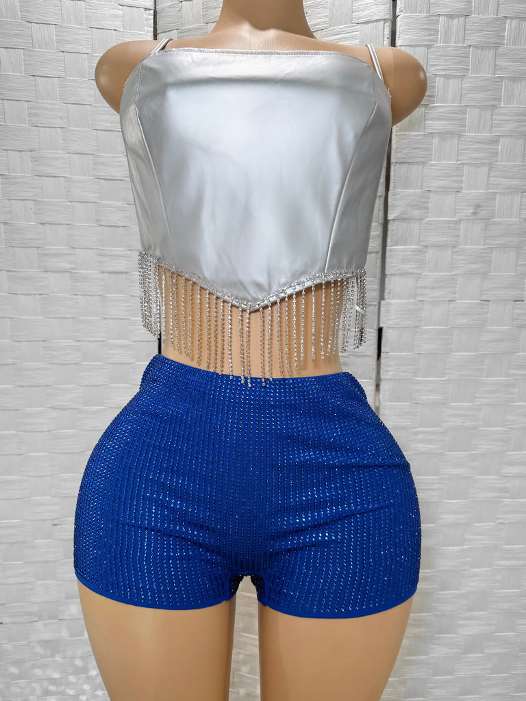 Our royal blue shorts are covered in rhinestones, perfect for a concert or special occasion!